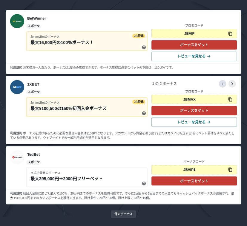 JohnnyBetがおすすめしたいブックメーカーは、業界最古の老舗ブックメーカーとして世界中にたくさんのファンを持つおすすめのブックメーカー、Bons、1XBETとBetWinnerです。