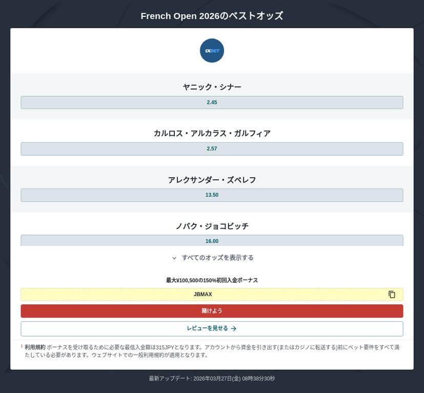 2. ローラン・ギャロス 2026 ブックメーカー