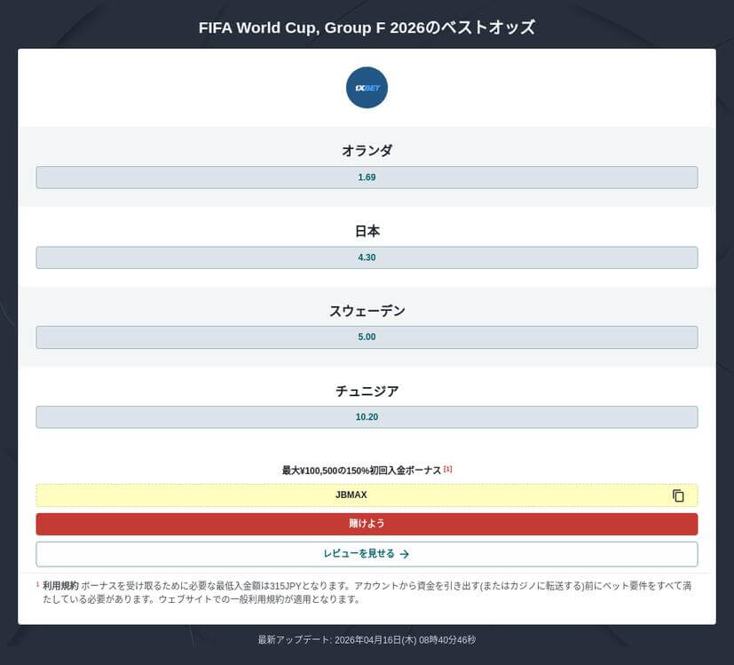 現時点では日本対スウェーデン優勝オッズは未発表ですが、グループ突破争いを左右しうる重要な一戦として注目されています。