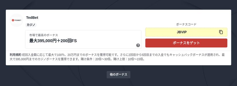 例えば、Tedbet (テッドベッド)では入金手数料は数円かかりますが、一度に100万円まで投入できるのが特徴です。オンカジ業界の決済で最も実績のある「Bank Transfer」の再購入金額が20万円までなので、PayPay銀行は高額入金したい時に最も適しています。もし登録することにしたら、テッドベットのボーナスコードをご利用ください。
